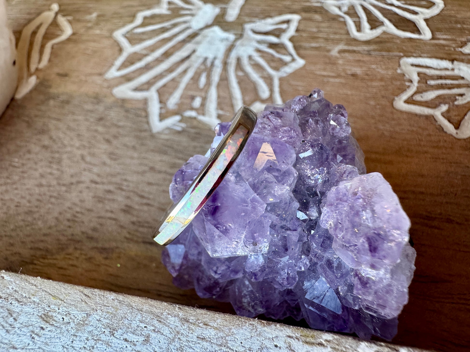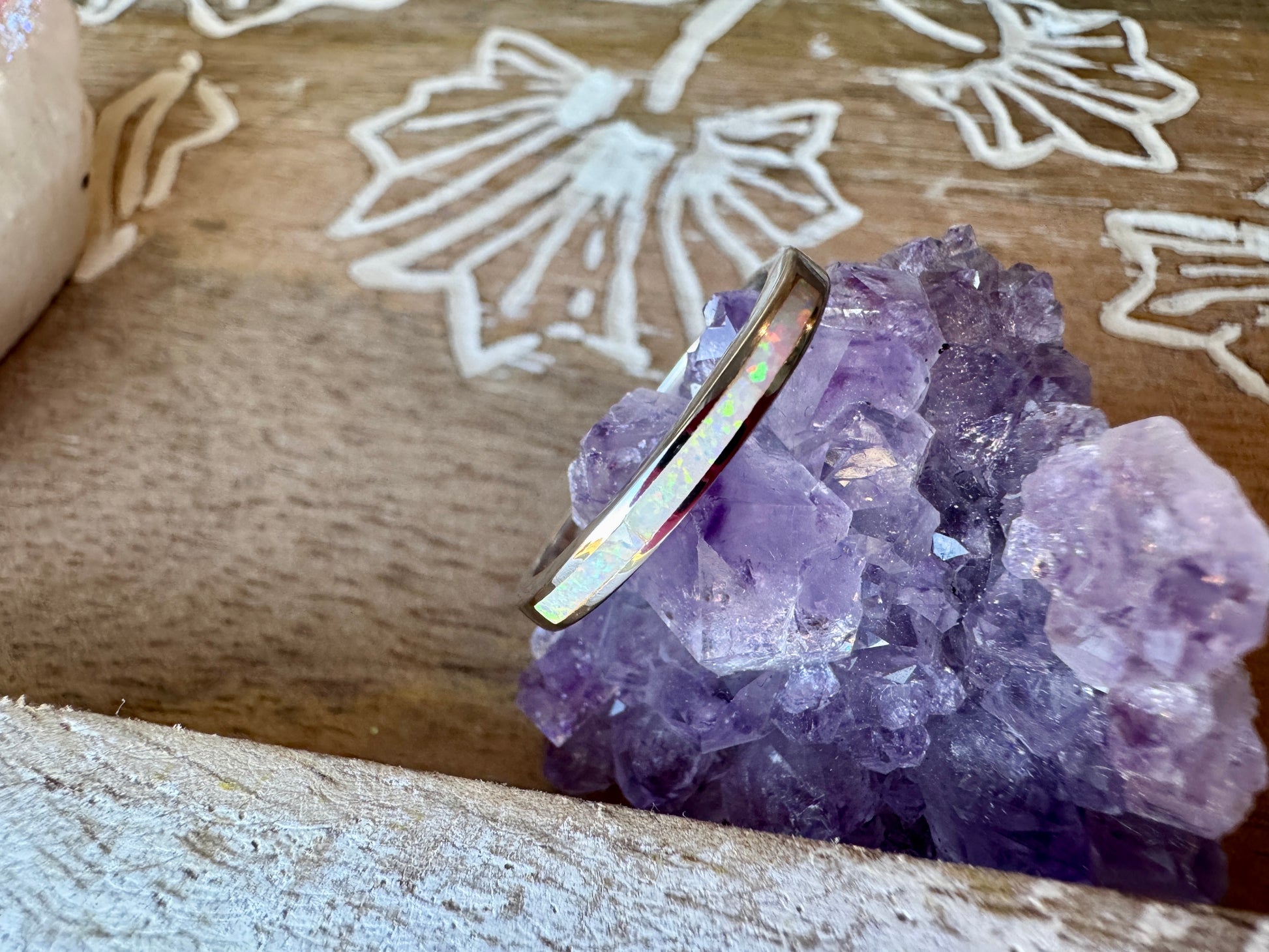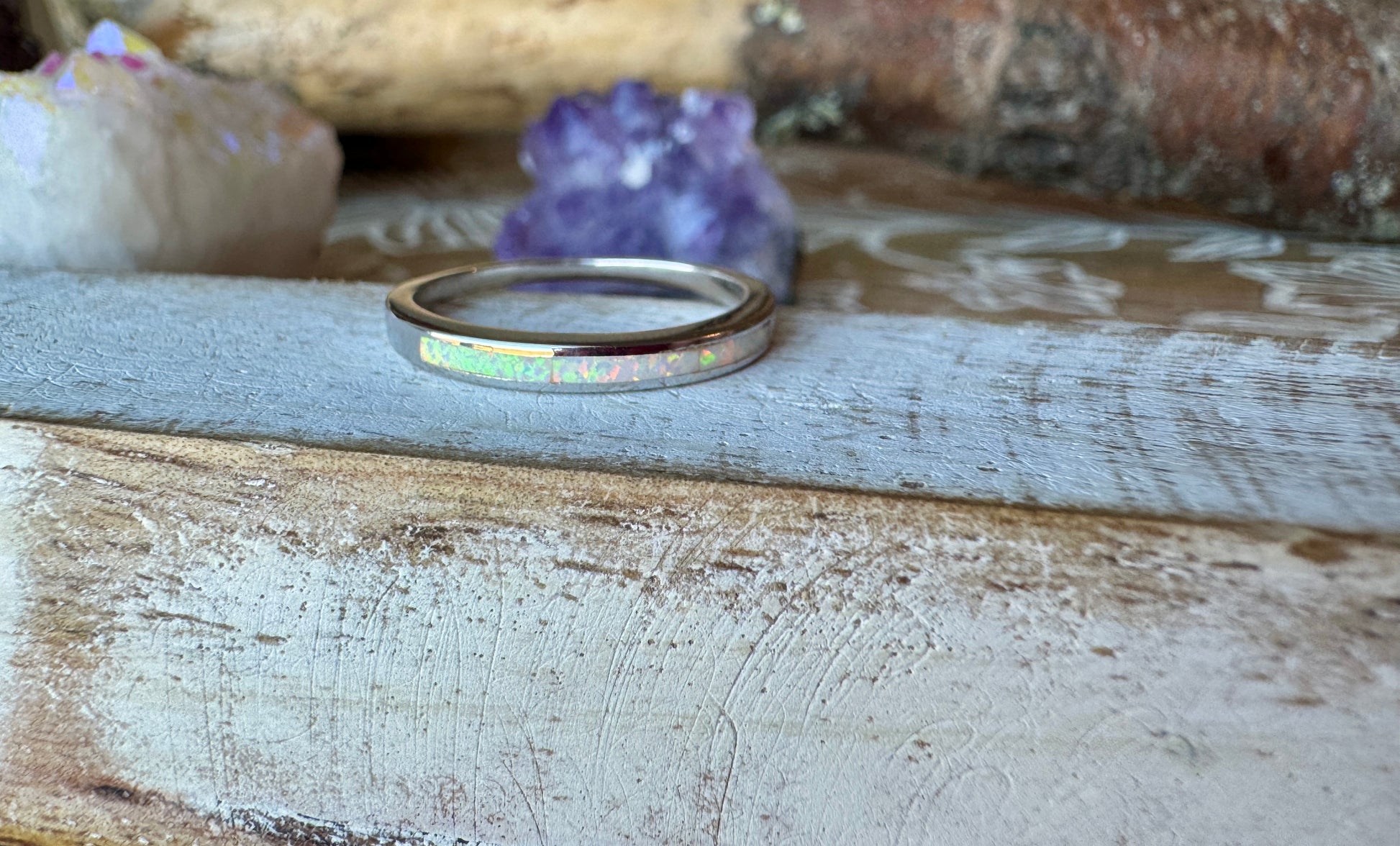 Expertly crafted from sterling silver, this ring features a stunning white opal inlay. The combination of precious metal and vibrant gemstone creates a timeless and elegant accessory for any occasion. Elevate your style with this luxurious and eye-catching piece.