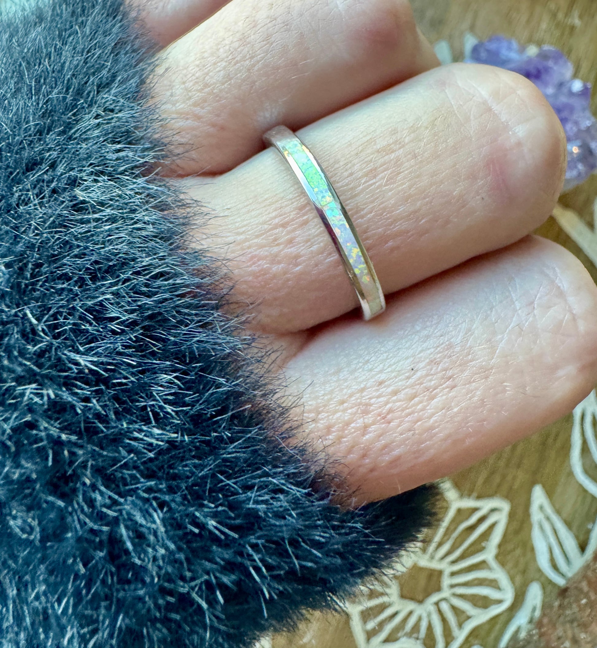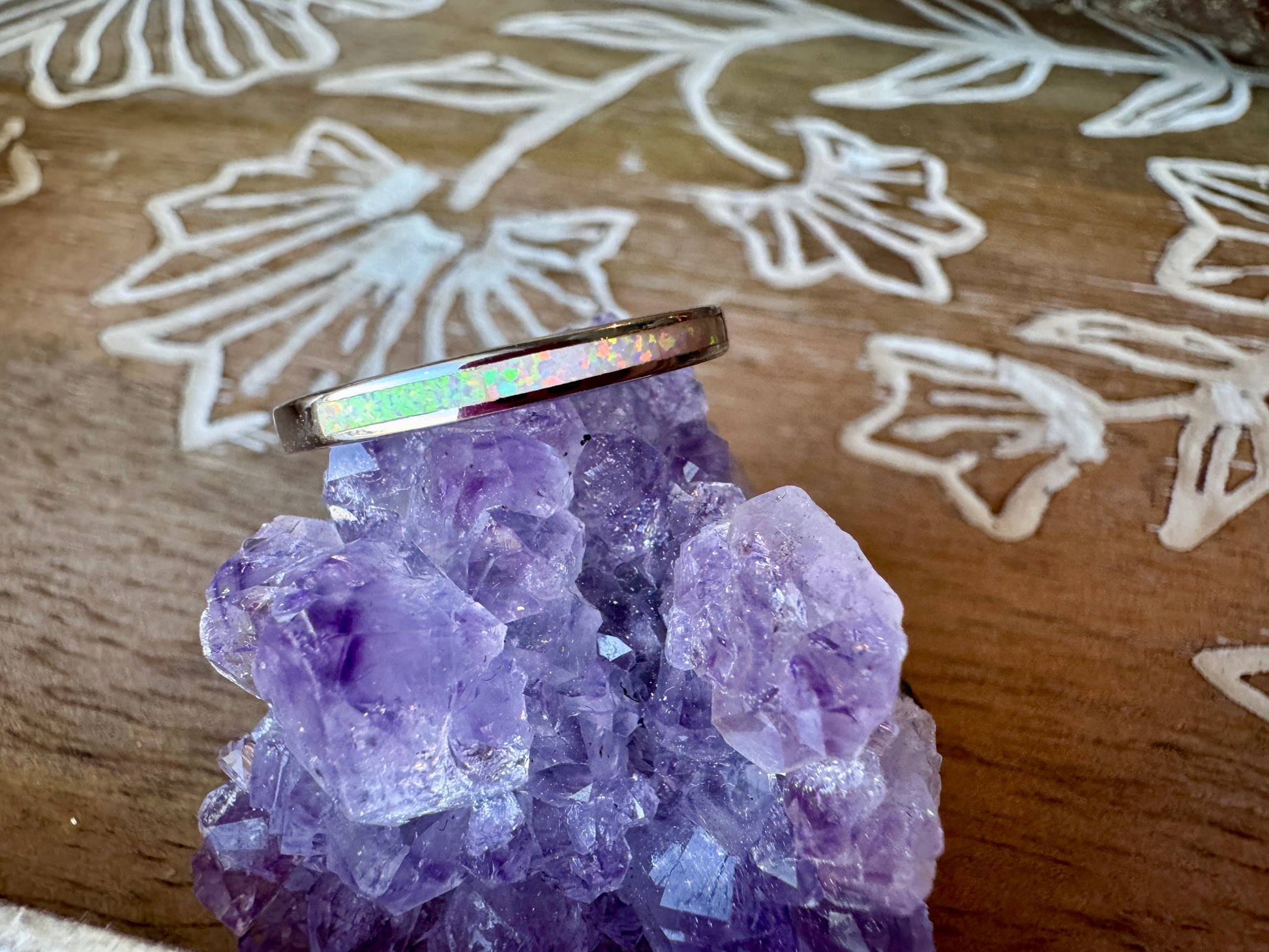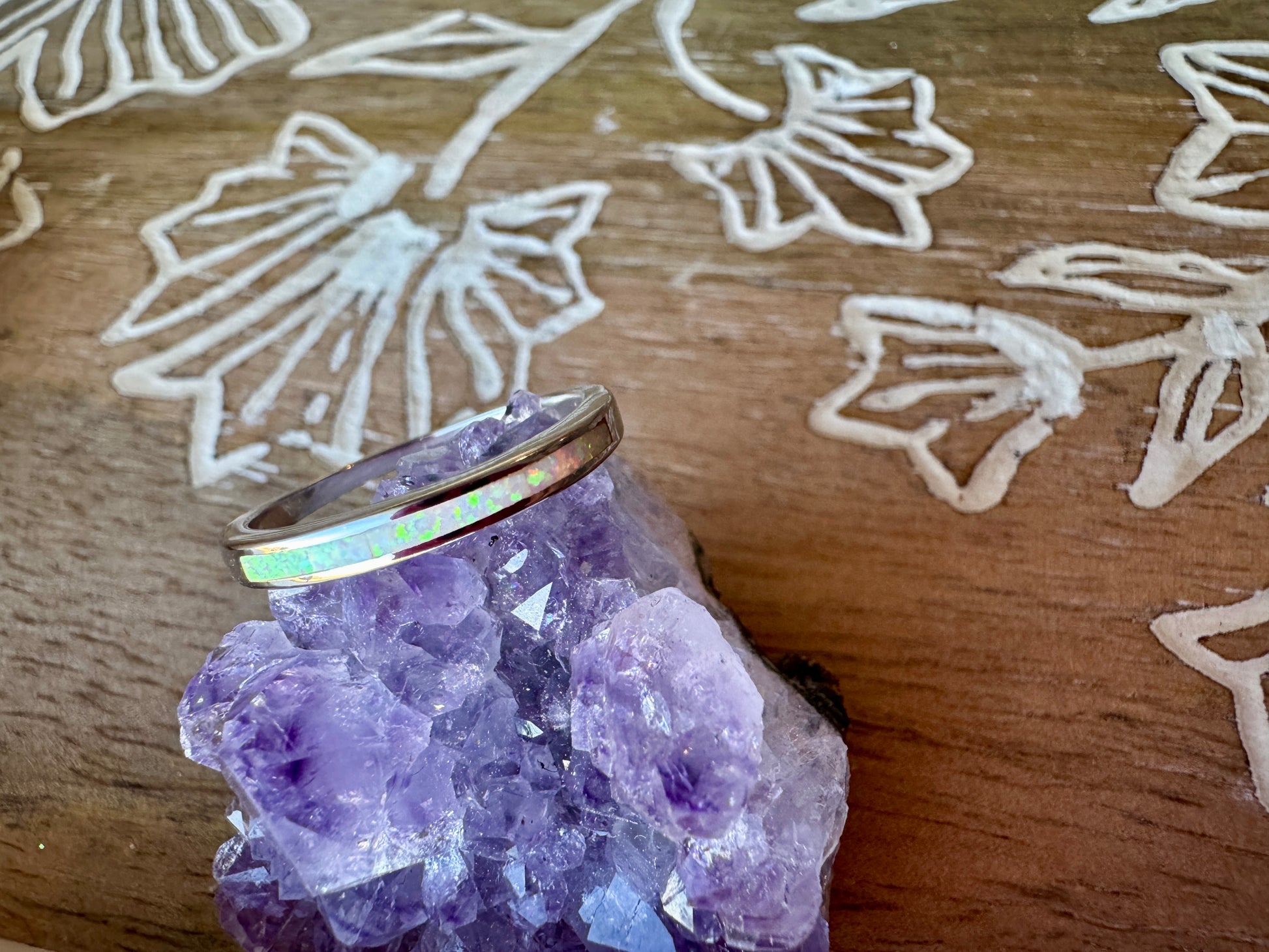 Expertly crafted from sterling silver, this ring features a stunning white opal inlay. The combination of precious metal and vibrant gemstone creates a timeless and elegant accessory for any occasion. Elevate your style with this luxurious and eye-catching piece.