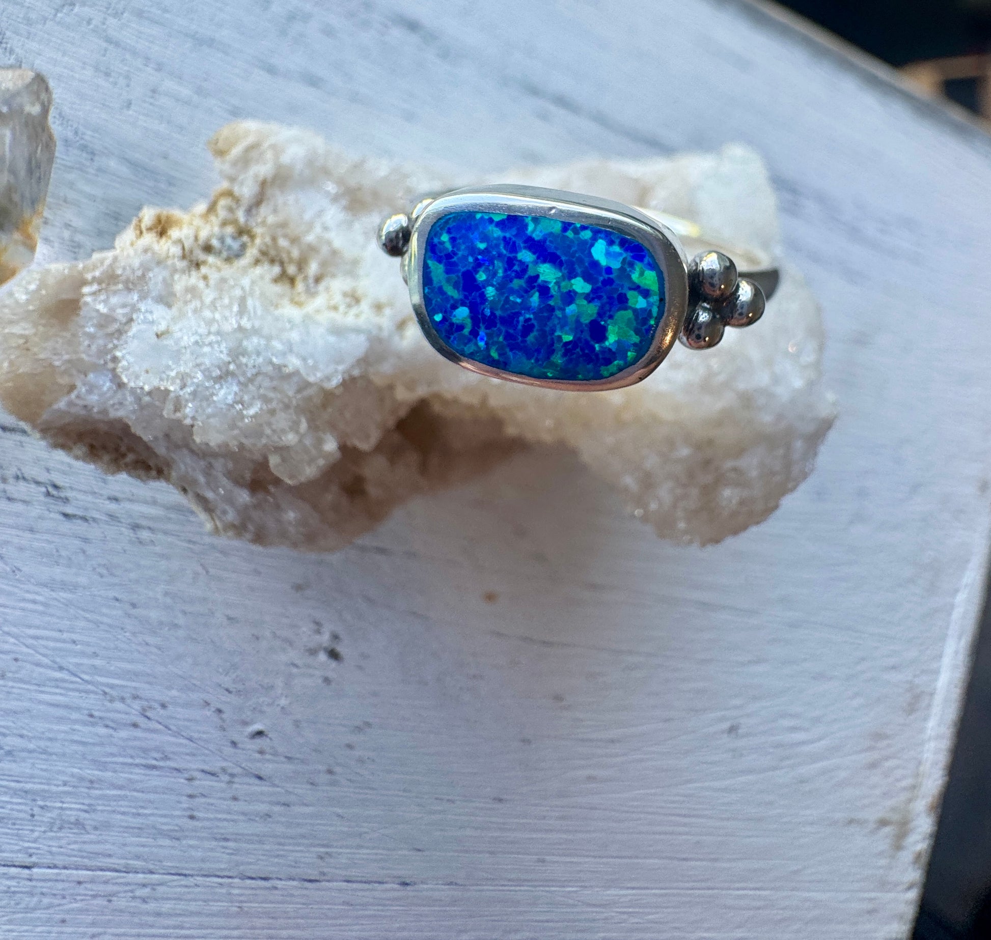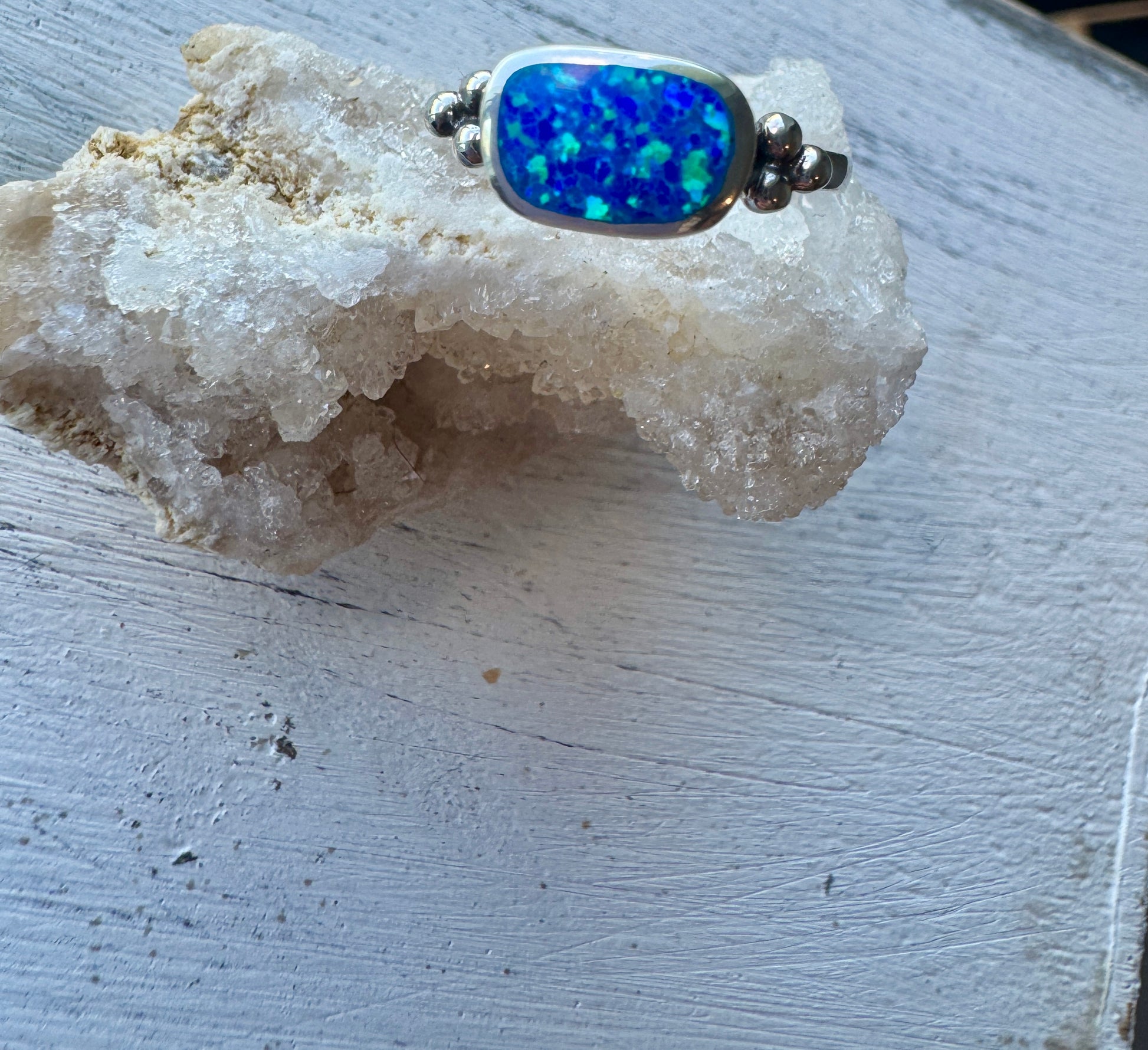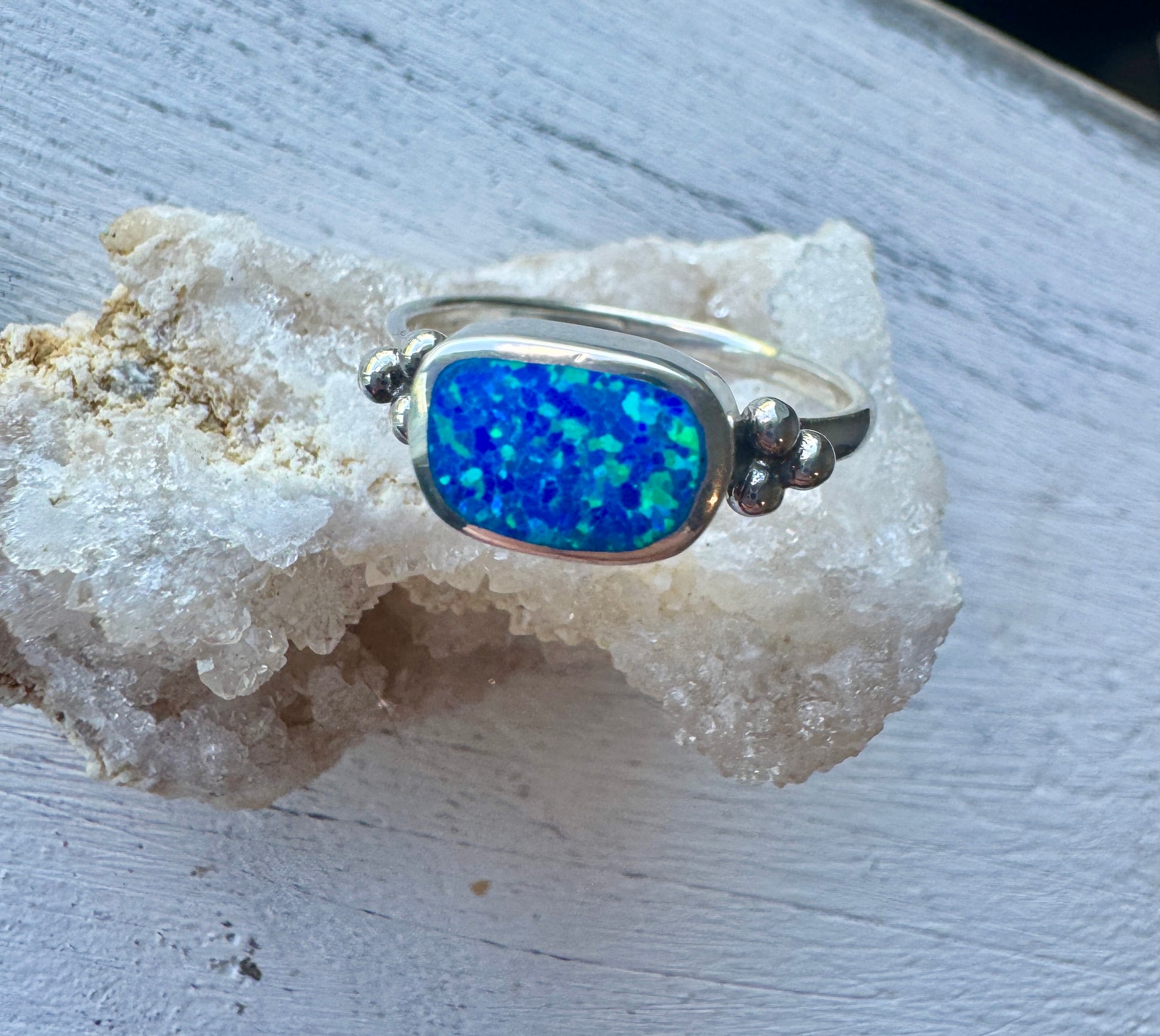 Experience the captivating beauty of our Enchanted Waters blue opal ring. Crafted with sterling silver accent beads, this ring is a stunning addition to any jewelry collection. With its sterling quality and captivating color, this ring is sure to turn heads and make a statement.