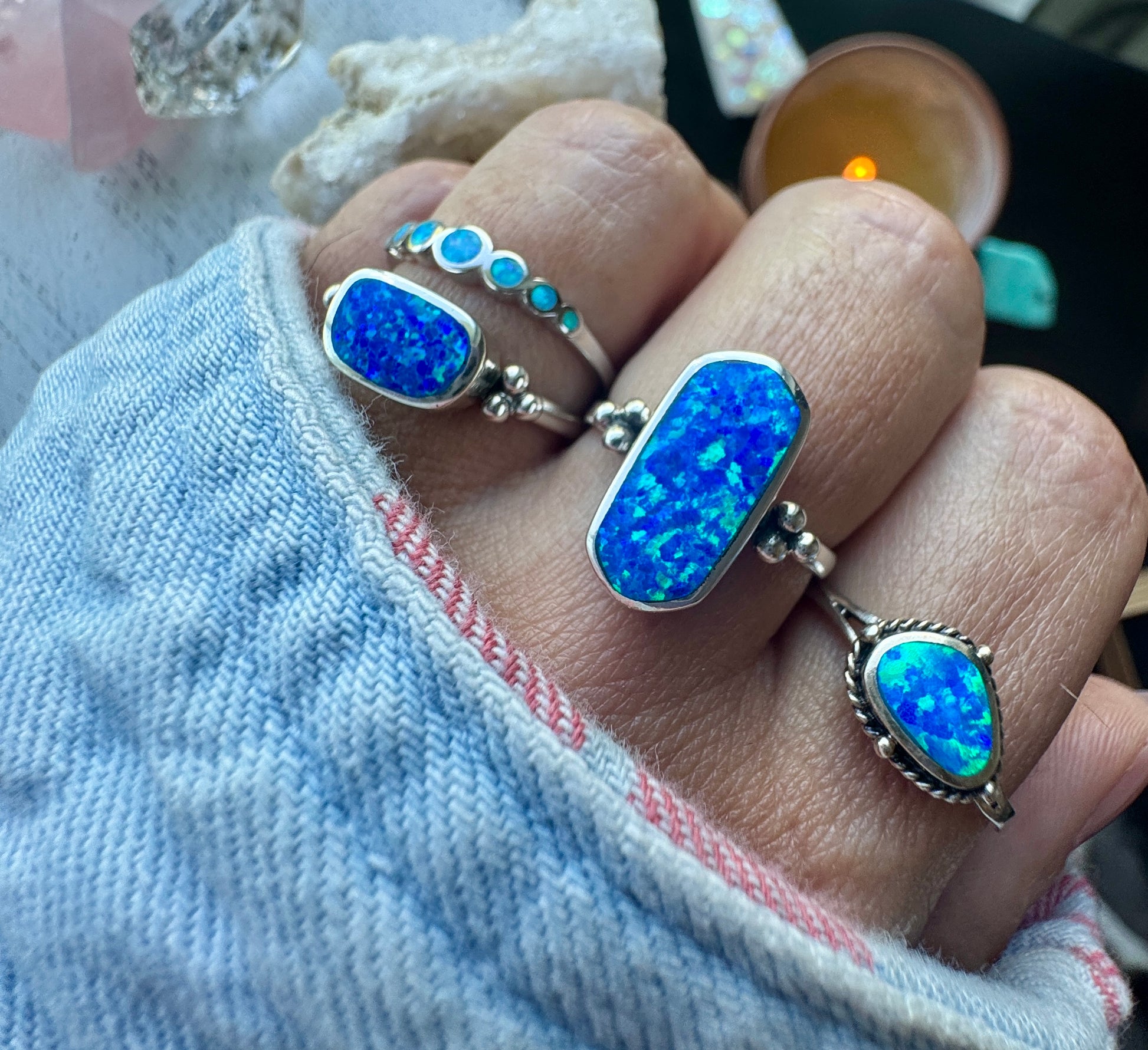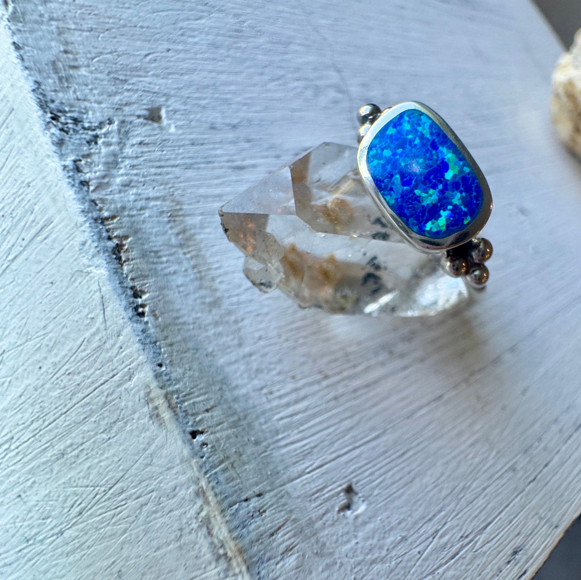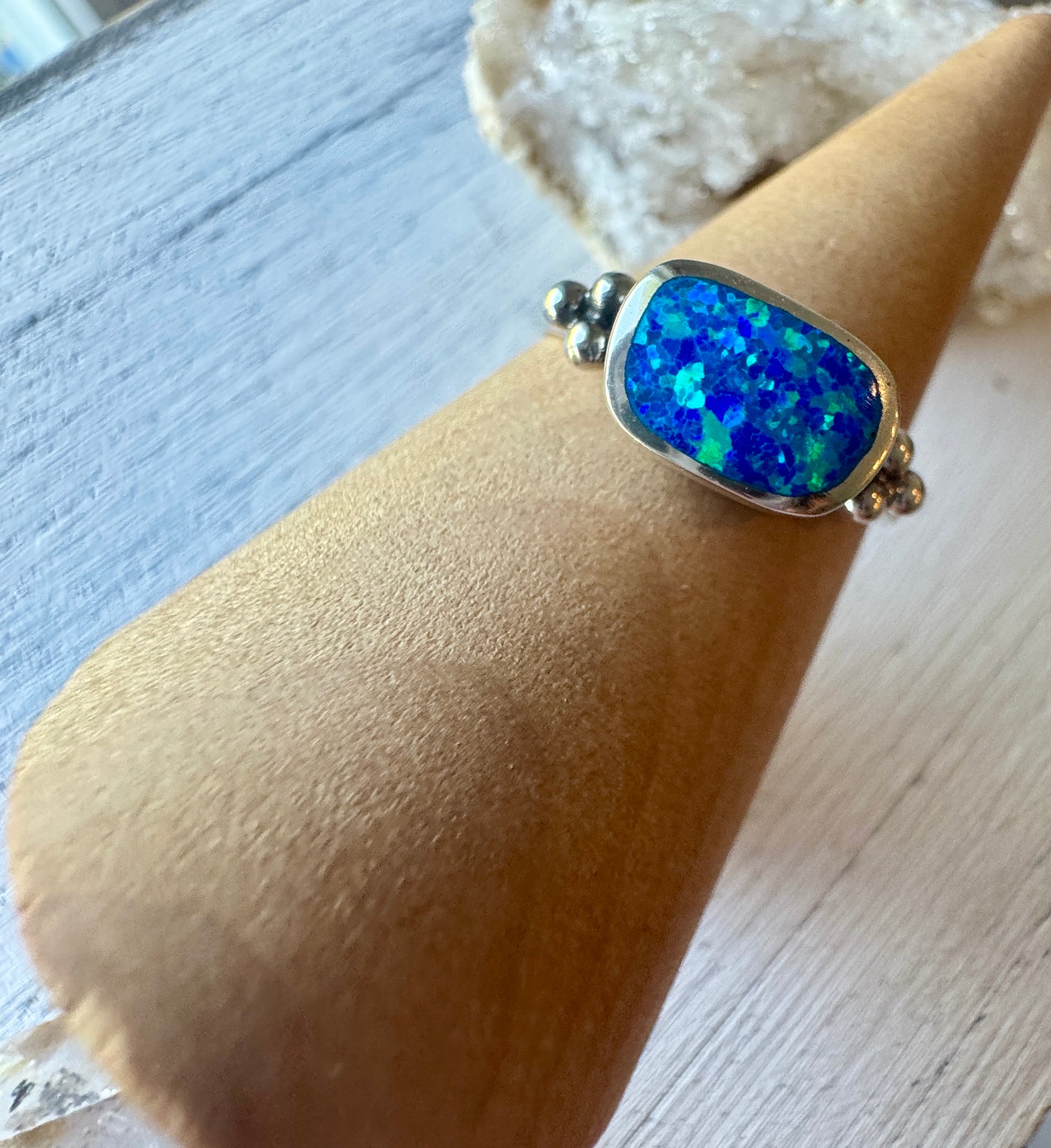 Experience the captivating beauty of our Enchanted Waters blue opal ring. Crafted with sterling silver accent beads, this ring is a stunning addition to any jewelry collection. With its sterling quality and captivating color, this ring is sure to turn heads and make a statement.