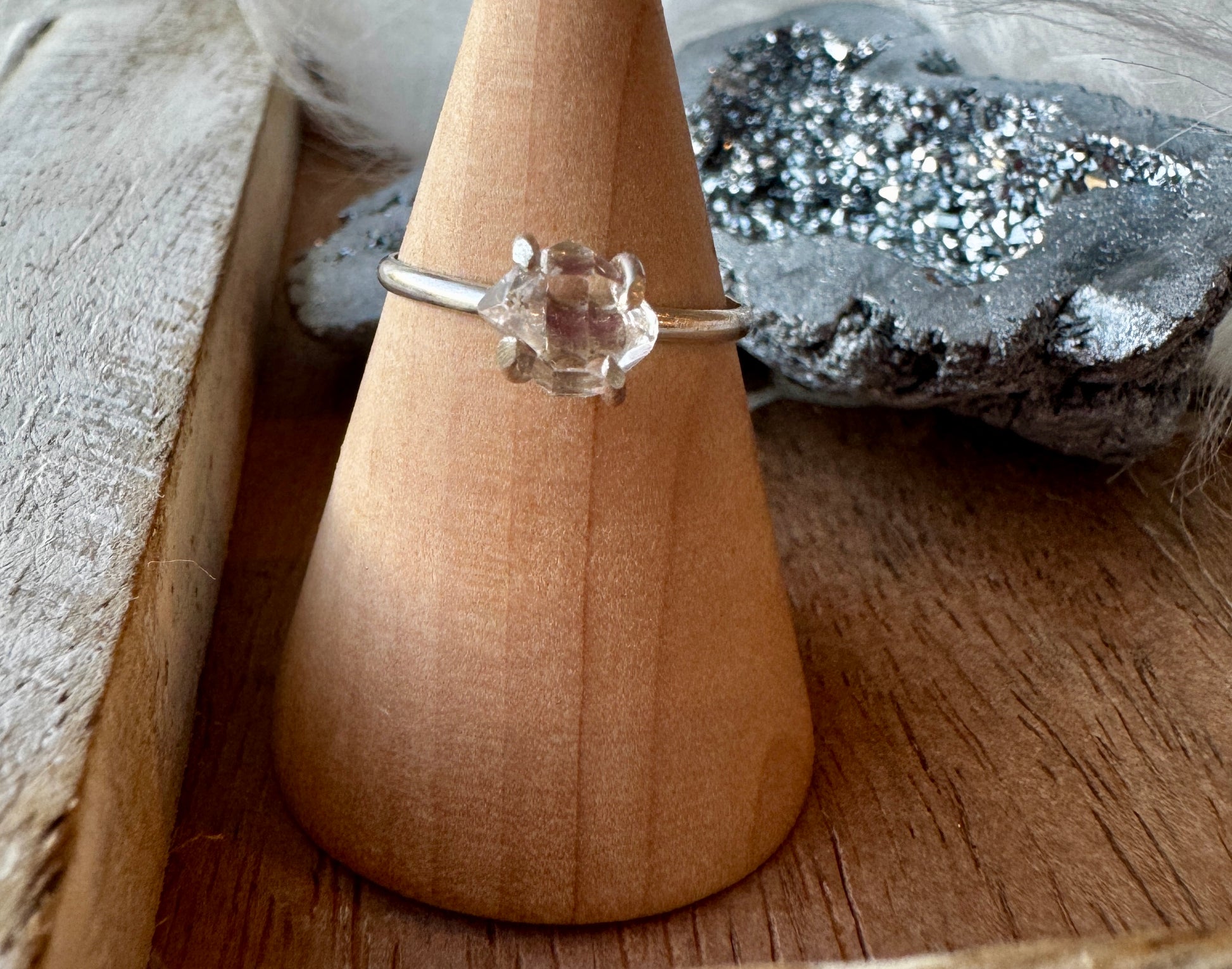 Discover the ultimate sparkle with our Herkimer Diamond Ring! Crafted with a prong setting and sterling silver, this ring beautifully showcases the stunning Herkimer diamond. Elevate any outfit and attract attention with this one-of-a-kind piece. Experience the power of this unique gemstone for yourself!